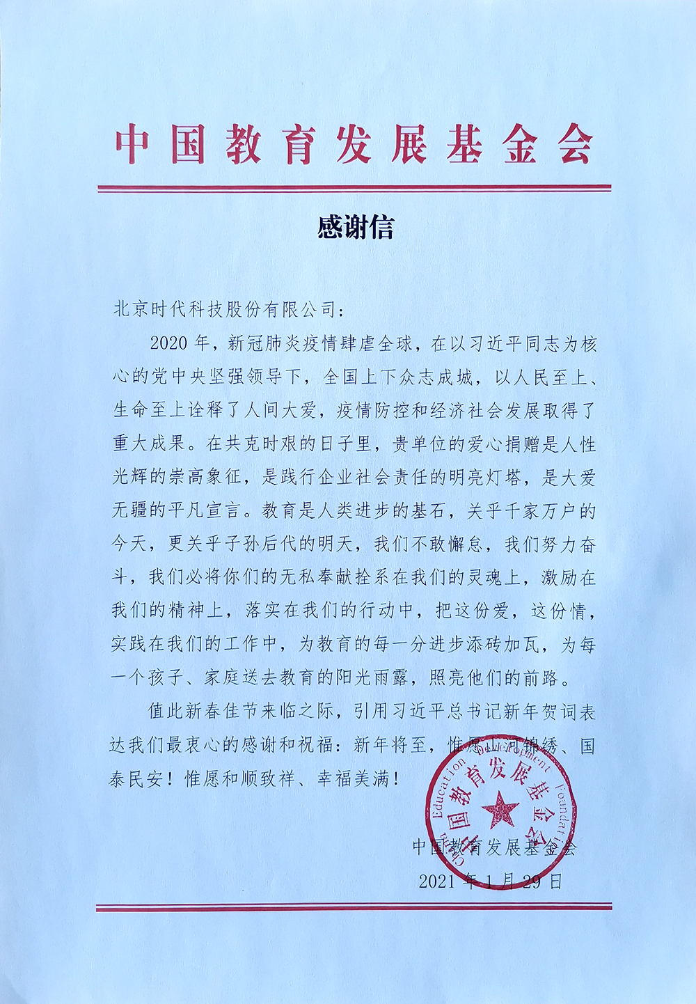 中國傳統(tǒng)的節(jié)日-新春佳節(jié)-來臨之際,中國教育發(fā)展基金會(huì)給北京時(shí)代科技股份有限公司發(fā)來了感謝信!這是中國職業(yè)教育行業(yè)對(duì)時(shí)代公司工作的嘉獎(jiǎng)和肯定,全體時(shí)代人將繼續(xù)努力工作為推動(dòng)中國職業(yè)教育事業(yè)的發(fā)展貢獻(xiàn)力量!