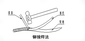 有些裂紋較寬或砂眼、氣孔直徑較大時,采用錘擊捻壓法有困難,可先用合適的鐵絲或焊條頭將裂紋或孔洞先鉚住,以減少外漏的壓力和流量,然后再快速焊。有些裂紋的周邊不規(guī)則時,可采用破布、薄木片、竹片塞進去再快速焊。注意的要點是一次只能先堵塞一段,然后快速焊,堵塞一段焊一段。