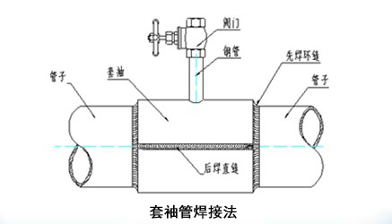 管道因磨損泄漏的面積較大時,用一段同徑或正好包住泄漏管徑的管子,長短尺寸視泄漏處的面積而定。把用來做套袖的管子對稱切割成兩半,焊上一個導流管,具體焊法與導流焊接法相同。在焊接順序上應先焊接管子與套袖的環(huán)縫,最后焊接套袖的焊縫。