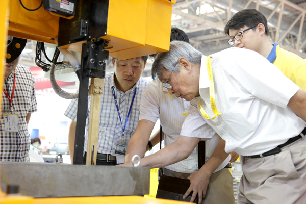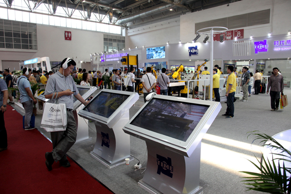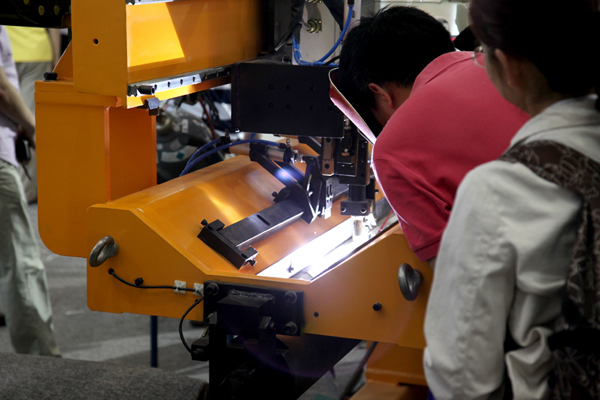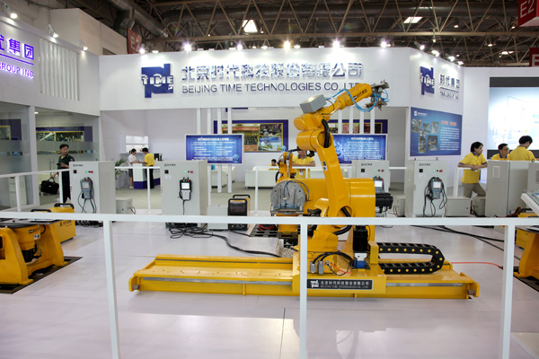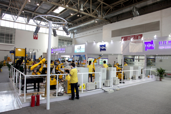 從展示內(nèi)容看,時(shí)代展臺(tái)分為三大部分:自動(dòng)焊設(shè)備展示區(qū),焊接電源展示區(qū),焊接機(jī)器人展示區(qū)。今年時(shí)代公司展示的6套機(jī)器人產(chǎn)品全部都是自己研發(fā)和制造的,這是一次時(shí)代自產(chǎn)機(jī)器人產(chǎn)品的集中亮相,引起了業(yè)內(nèi)和觀眾的極大關(guān)注。時(shí)代機(jī)器人配合時(shí)代自制的高精度變位機(jī)系統(tǒng)在展臺(tái)上表演了復(fù)雜焊縫的焊接及復(fù)雜圖形的切割,焊縫外形美觀精致,切割尺寸精準(zhǔn),切口光滑美觀。大批的觀眾舉著焊帽圍攏在演示臺(tái)附近悉心觀賞時(shí)代機(jī)器人焊接與切割的全過程。4套機(jī)器人在時(shí)代自產(chǎn)操作系統(tǒng)的指揮下與變位機(jī)導(dǎo)軌相配合表演了搬運(yùn)工件、焊接裝配工件的全過程,演示動(dòng)作準(zhǔn)確穩(wěn)定。