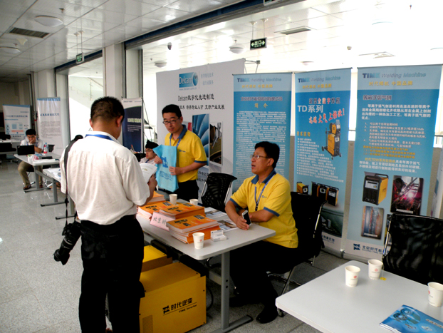 比賽期間所有參賽的領(lǐng)隊(duì)、教練和參賽單位領(lǐng)導(dǎo)都被安排在學(xué)院圖文中心二層的大休息廳通過(guò)大屏幕觀看賽場(chǎng)動(dòng)態(tài)。比賽組委會(huì)只是在上午10點(diǎn)和下午3點(diǎn)安排大家去實(shí)地賽場(chǎng)觀摩。這種方式和往年相比有所不同。所以圖文中心二層成為參賽隊(duì)交流和溝通的唯一場(chǎng)所。廠家的展示區(qū)也恰巧設(shè)在這里,我們可以很方便地與參賽院校領(lǐng)導(dǎo)零距離接觸。時(shí)代焊機(jī)的展位被安排在休憩區(qū)前排。為了做好比賽展示活動(dòng),公司提前準(zhǔn)備了三套TD系列比武用機(jī)分別是:PNE30-315ADP、TDN 3500、TDW 4000。還準(zhǔn)備了相關(guān)樣本資料和簽到用具。參加展示活動(dòng)的三位時(shí)代同仁統(tǒng)一穿著時(shí)代工服,給人以整齊專業(yè)的印象。時(shí)代展示區(qū)的后面用四套易拉寶展具組成展墻,介紹時(shí)代概貌和公司各類新產(chǎn)品、新工藝。開(kāi)賽的第一天,不時(shí)有參賽單位老師來(lái)時(shí)代展臺(tái)索要資料和咨詢技術(shù)。他們中的大部分人都是時(shí)代焊機(jī)的用戶。不少老師對(duì)時(shí)代產(chǎn)品的現(xiàn)狀和未來(lái)服務(wù)方式十分關(guān)心,還有的詢問(wèn)明年焊接大賽的籌備情況,有些老師還和我們一起回顧往屆賽事的趣聞和花絮,溝通氣氛十分融洽。也有一些院校有采購(gòu)焊接設(shè)備的意向,前來(lái)洽商具體商務(wù)問(wèn)題。對(duì)此我們都一一作答。參賽單位對(duì)時(shí)代的認(rèn)知度十分高。本屆沒(méi)有焊接比賽項(xiàng)目,但時(shí)代焊機(jī)依然來(lái)津展示,為此參賽單位對(duì)時(shí)代的做法表示贊賞。