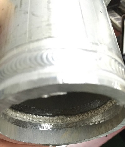 第二模塊鋁合金構(gòu)建中鋁管的焊接難點(diǎn)主要在于背部融透(如圖6)和內(nèi)在質(zhì)量的保證。背部融透主要是考驗(yàn)選手對(duì)熔池的理解,在組對(duì)焊縫0間隙的情況下,如何能夠識(shí)別熔池溫度是否達(dá)到,送遞焊絲時(shí)間的選擇,這些都至關(guān)重要,而且在焊接過程中,由于鋁合金的導(dǎo)熱系數(shù)大,焊接過程中隨著溫度的上升,焊接速度也會(huì)越來越快,如果手法跟不上,只是依靠小電流慢速焊,這樣就會(huì)在某一點(diǎn)(比如引弧處)不停的加熱,局部時(shí)間加熱久了焊縫內(nèi)部會(huì)很容易出現(xiàn)過熱裂紋,焊縫表面發(fā)白無光澤,所以鋁合金焊接一般要求大電流快速焊接,也是為了在引弧初期就能夠快速打開鋁合金表面的Al2O3薄膜。該薄膜熔點(diǎn)高達(dá)2050℃,極大地超出了鋁的熔點(diǎn)(660℃),由于這層薄膜的保護(hù),所以鋁不易產(chǎn)生腐蝕,但在焊接時(shí),Al2O3會(huì)阻礙熔池金屬良好結(jié)合,容易形成夾渣氣孔等缺陷,可以說是焊接的障礙,所以在鋁合金焊接中要想達(dá)到探傷一級(jí)確實(shí)很難。一般要先進(jìn)行酸堿水清洗或機(jī)械清理等前期處理。還要保證干燥不潮濕的情況下焊接才能夠保證質(zhì)量,當(dāng)然對(duì)于選手的焊接操作技能也是首選。這次參賽的65名選手中,該項(xiàng)射線探傷滿分40分的情況下只有一人滿分,30分以上的有7人,內(nèi)在質(zhì)量不得分的占多數(shù)。這與鋁合金焊接普及面較窄也有關(guān)系。隨著這項(xiàng)賽事的不斷進(jìn)展。我想在不久將來大家一定會(huì)攻克難關(guān),充分掌握好這門技術(shù)。